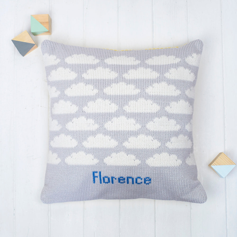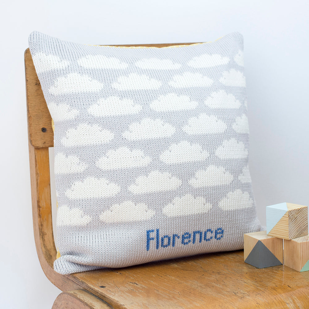 This is a personalised cushion with knitted clouds on the front and woven fabric on the back.