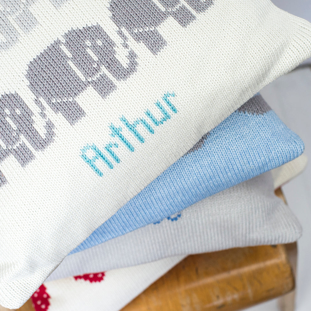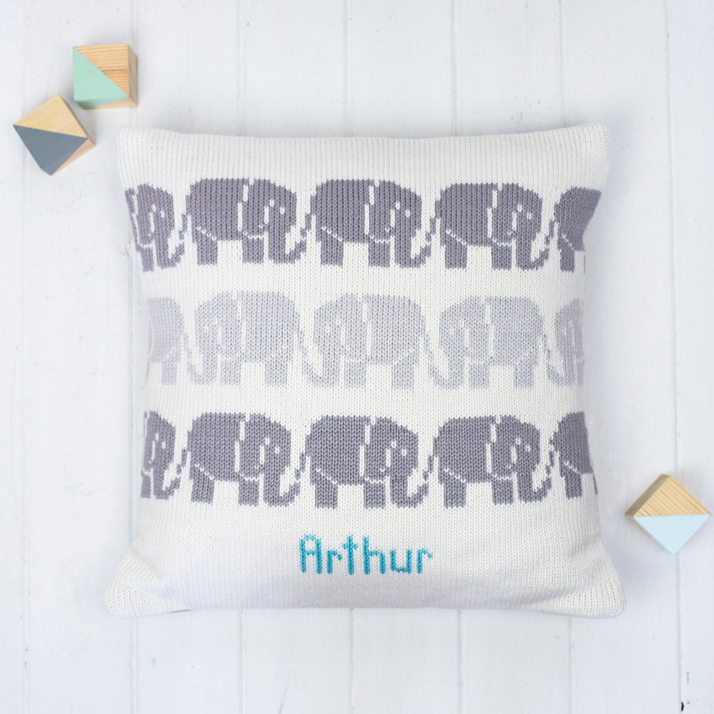 This is a personalised cushion with knitted elephants on the front and printed fabric on the back.